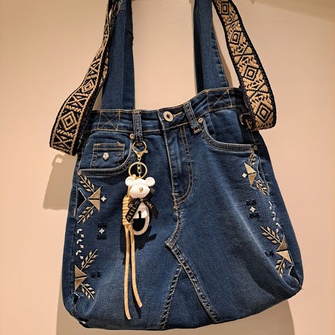 Redesignet denim / dongeriveske selges.H- 31 cm, B- 38 cm.