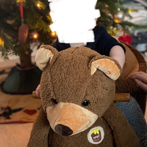 Selger pent brukt gyngedyr. God støtte når barnet sitter. Synger når man trykker på det ene benet.