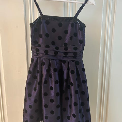 Fin pyntet kjole som kan brukes enten med eller uten bolero. Kjolen er grå / sølvfarget i bunn, med mønster i svart. Litt tyll nederst på kjolekanten. Boleroen er gråsvart med sølvfarge i, litt glitter-effekt. Selges samlet for 150kr