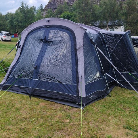 det er praktisk tilgang via den skrånende inngangen foran, og de har en base som kan foldes helt flat. Avhengig av været og familieaktiviteter, kan sidedelene skyves opp og rulles vekk for bedre tilgang, ekstra ventilasjon eller for å lage en dyp kalesje. Hvis bare den ene siden rulles vekk, får du et verandalignende område på teltet ditt. De store vinduene gir et lyst og luftig inneområde når dørene og sidene er med glidelås, slik at du får rikelig med komfort på campingturen.