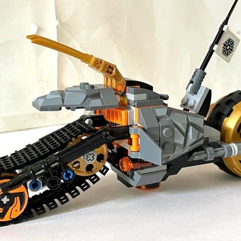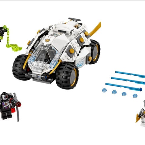 Ninja trommelracer (titanium ninja tumbler) 70588. Utgått sett fra 2016 med Zane med metallfarget ansikt og to nindroider, og bil med transformeringselementer. Bilen utvider seg til begge sider ved hjelp av spaken. Se nærbildene for detaljer og funksjoner. Tre minifigurer. To kanoner som skyter lange piler og to mindre kanoner som skyter små kuler. Komplett med alle brikker og de fleste klistremerker.