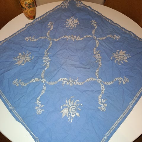 Vintage mønstret blå duk 83 x 87 cm. Ganske falmet. Har ikke lapp, men kjennes som bomull.