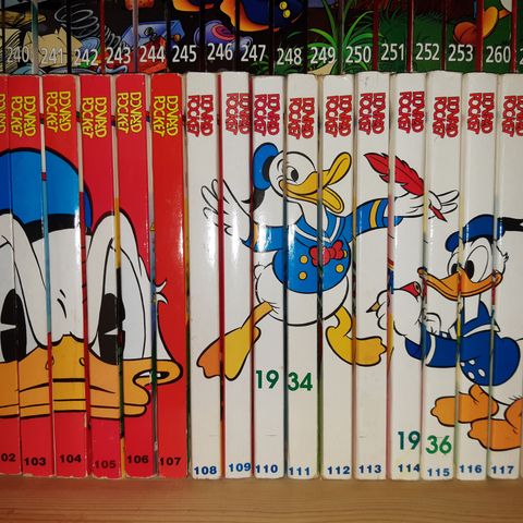 Vi har en del Donald-pocket liggende som vi selger unna i bunker på nummerserie. Se vedlagte bilder. Varierende produksjonsår, men alle er lesbare. Nesten komplett serie foruten nr. 79, 81, 85 og 94.