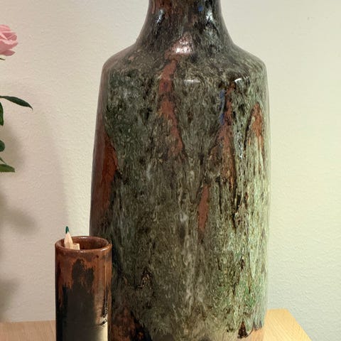 Fantastisk flott kunstverk fra nestoren innen norsk keramikk, Erik Pløen. Livlig og ekspressiv glasur med tre åpninger i toppen. Fin til å stikke kvister eller blomster i alt ettersom.