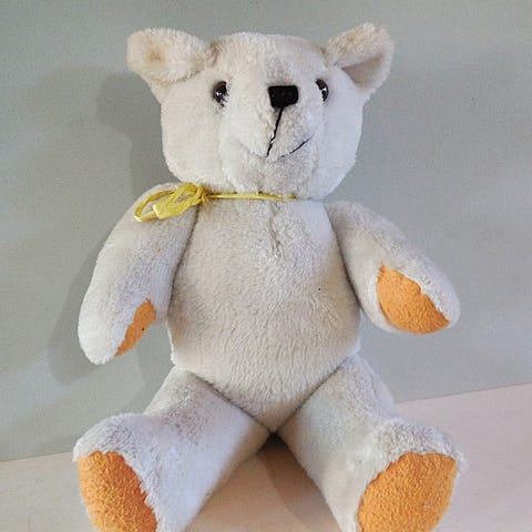 Dette er en liten, myk beige teddybjørn med runde poter og et søtt, vennlig utseende.