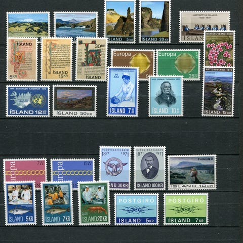 115 forskjellige stemplede frimerker fra Island 1970-79 (AFA 435-550). Kun AFA 472 mangler på komplett. Overveiende god rundstemplet kvalitet. AFA-verdi opptalt til kr 588.