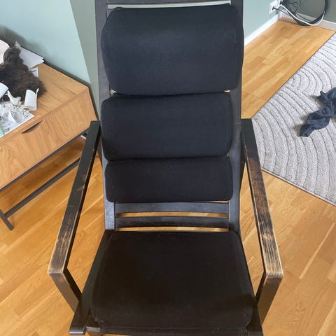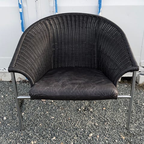 Ikke spesielt behagelig å sitte i, men et blikkfang. Jeg har ikke navnet på arkitekten som har tegnet stolen. Litt rusten.
