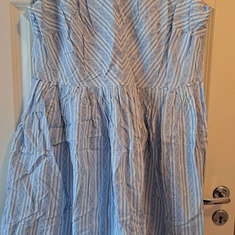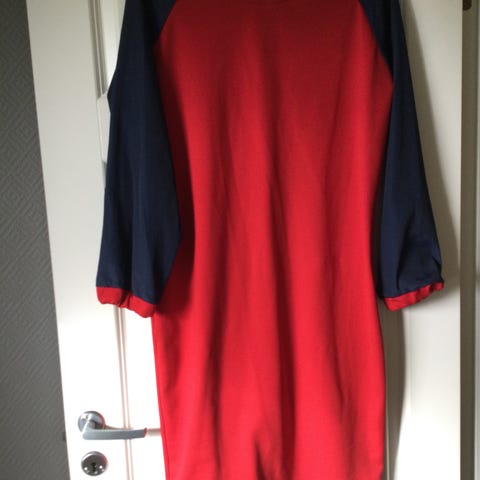 Kjole med blomstrete mønster. Den er i rosa, lilla og hvitt, og har en sløyfe øverst. Har lommer foran.