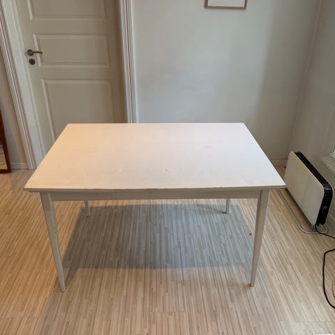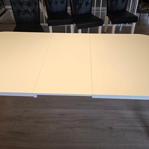 Selger et Bjursta bord fra IKEA, og 4 spisestoler fra jysk. Bordet er kjøpt i 2015, og har noen bruksmerker rundt omkring. Bordet er 140cm langt, men kan legge i 2stk innleggsplater på 40cm hver, så bordet blir 220cm langt.