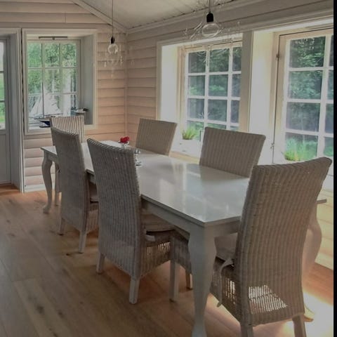 Spisestolene er fra Jysk, usikker på navn og alder. Stolene er også noe slitt i skinnet.