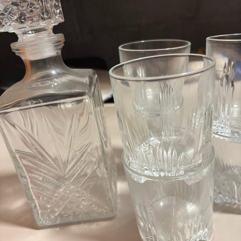 Av krystall. Diameter 6,5cm og høyde 8cm. Ingen skader og lite slitasje. Pris er samlet.