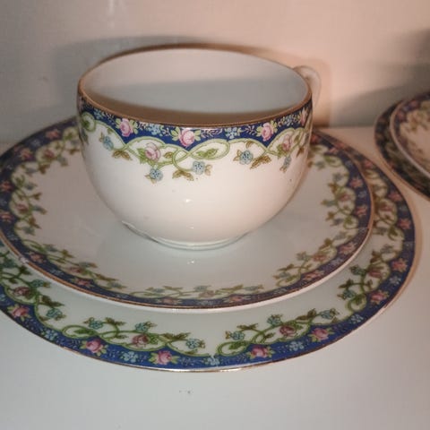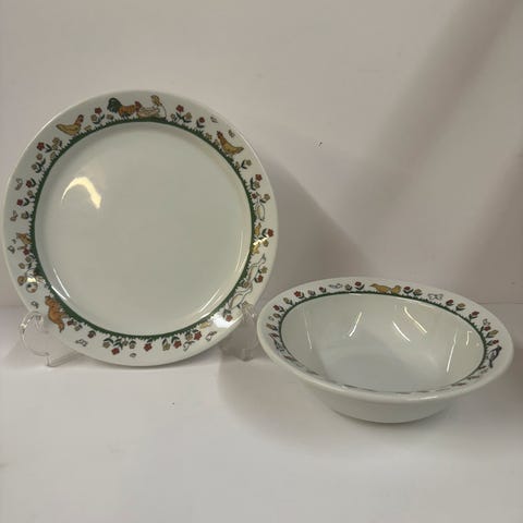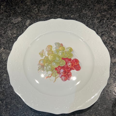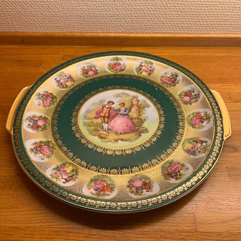 Vakkert porselensfat med romantiske motiver og gullfargede detaljer. Skålen er dekorert med scener av par i 1700-tallsklær i idylliske omgivelser. Perfekt som pynt eller til servering av snacks.