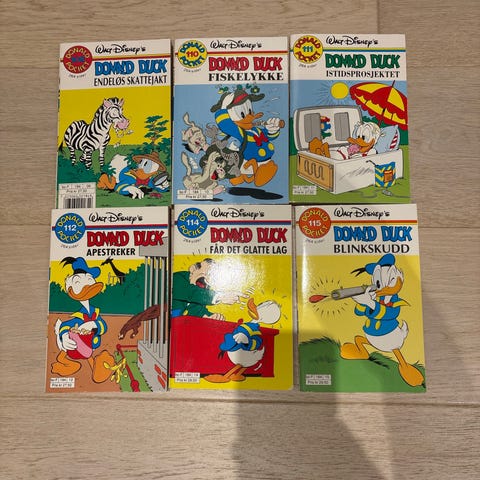 Vi har en del Donald-pocket liggende som vi selger unna i bunker på nummerserie. Se vedlagte bilde. Varierende produksjonsår, men alle er lesbare.