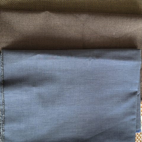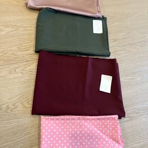 3 typer stoff. Blått faststoff (1 m), blåturkis faststoff (0,65 m) og svart litt stretch (0,95m)