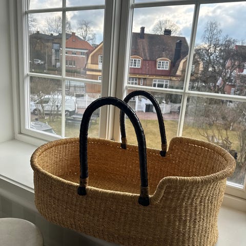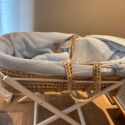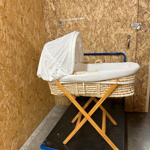 Nydelig moseskurv med stativ. Fin til å ha i stua for eksempel ☺️ Babynestet fra Najell passer fint oppi.