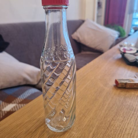 Selger en retro sodaflaske med noen originale kullsyrepatroner (sparklets) i eske, etter hytteopprydding.