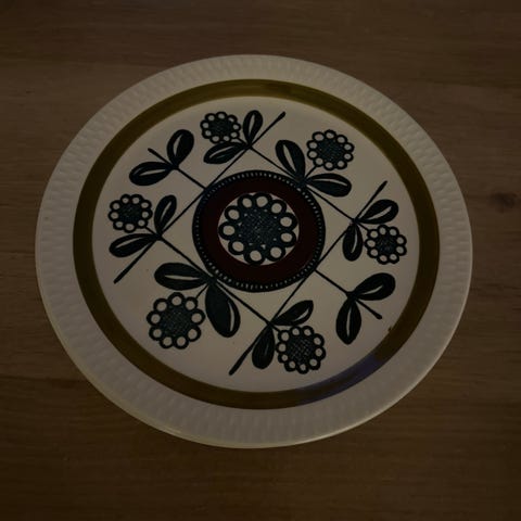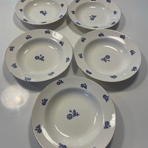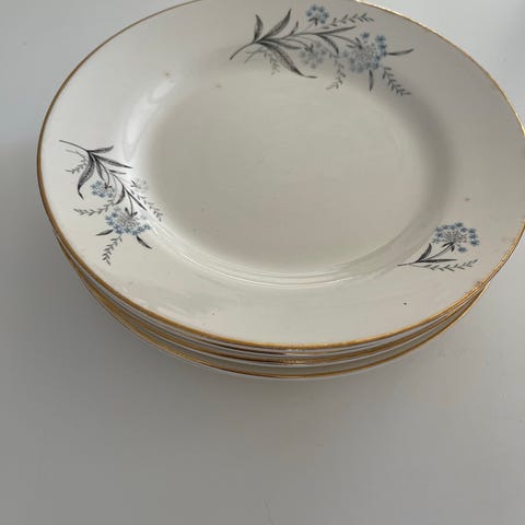 3 tallerkener med rillet kant fra Figgjo. Blå og gul blomsterdekor. Jeg har ikke klart å finne navnet på mønsteret