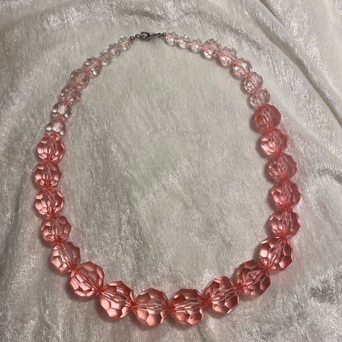 Halskjedet er pyntet med røde perler av metall eller plast, i forskjellige størrelser. Det er i veldig god stand.