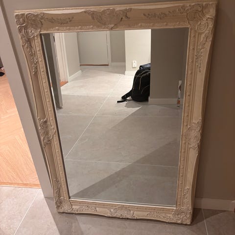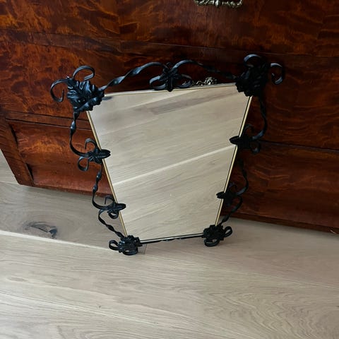 Dette er et ganske tungt speil. Glasset er like fint. Speilet er spesiallaget og fins ikke i møbelbutikker så er derfor ingen merker fra en eventuell fabrikant. Platen bak er skrudd inn med skruer. Det må hentes