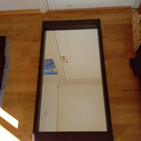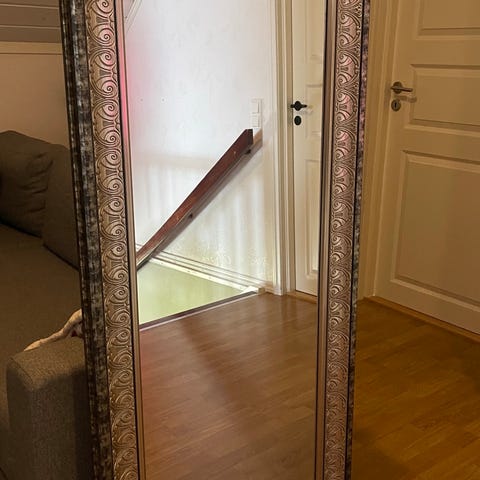 Speil .Høgd 93cm, bredde 53cm, dybde 3cm . Sort ramme.
