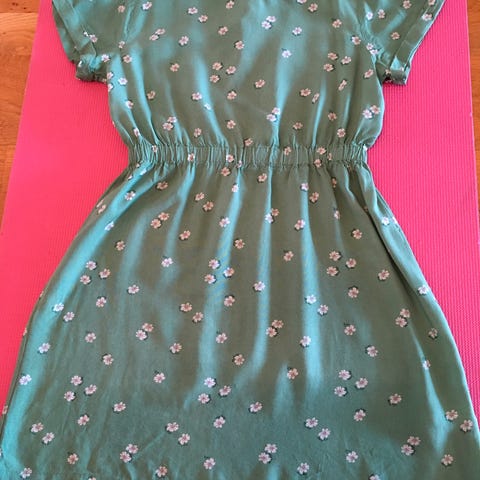 Supersøt og anvendelig kjole selges. Merket er Mini Tribu, og den er laget av 100 % bomull. Fargen er mer okerfarget eller sennepsgul enn "vanlig" gul. Denne passer like godt alene en sommerdag, som med en trøye under med strømpebukse/tights på litt kaldere dager. Så denne kan "vokse" litt med barnet. Knapp i siden. Størrelse 10 år.