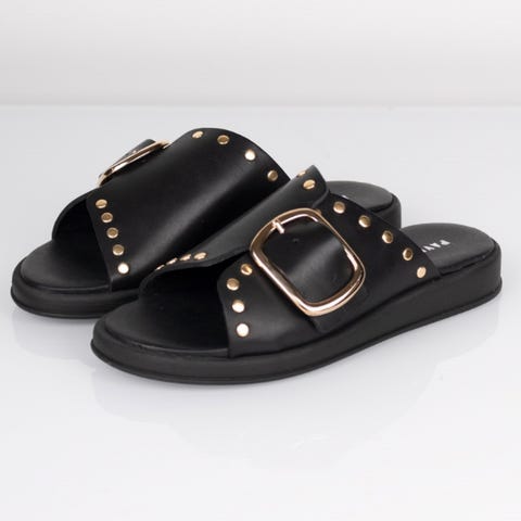 En nøye utformet sandal i glatt svart ekte skinn i gladiatorstil. En sko med brede stropper på toppen av foten og rundt ankelen som justerer alle kroppstyper med sine tre gullspenner. Helt skinnfôrede sko med en tynn skumfôret skinninnersåle. De har en ton-i-ton plattformsåle.