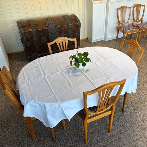 Møblene har gitt oss mange fine stunder i 40 år og har derfor ulike bruks/slitasje merker. Se eksempler i bildene. Likevel har møblene både sjel og stil og kan forhåpentligvis glede andre etter oss. Bord og skjenk: 750.- samlet. Enkeltvis 500.- pr enhet. Møblene står i garasjen og kan sees/hentes etter avtale. Mål skjenk: B- 1.84, H- 0.82, D- 0.44. Mål bord; L- 1.40/2.36 (inkl 2 plater på hver 0.48), B- 1.00, H- 0.70.