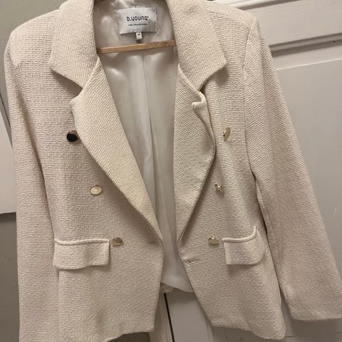 Fin blazer i mørkeblå farge fra B-young. Denne er en del brukt, men fortsatt i fin stand. Eneste anmerkningen jeg kan finne er at den er noe nuppete. Det kan kanskje la seg fjerne med nuppefjerner (?).