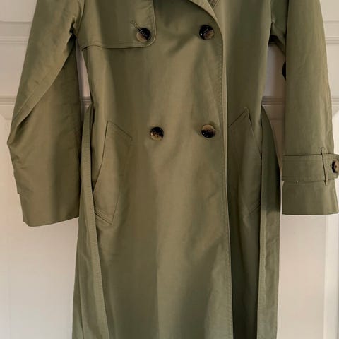 Kort, grønn trenchcoat med avtagbar hette fra Marie Philippe.