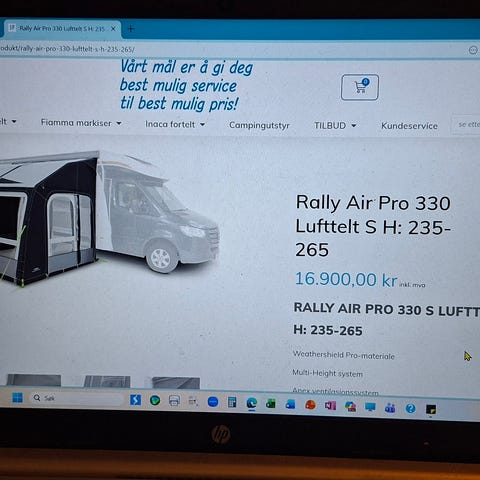 Da vi har byttet bobil så passer ikke luft teltet den nye bobilen. Det er nå til salgs. Selges for kr. 10000.- ferdig prutet