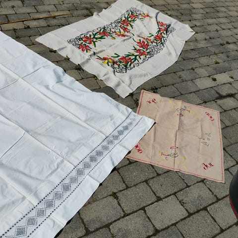 Fint gammelt håndarbeid overlaken med monogram og heklet mellomverk