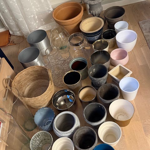Potter i glass til å henge i vinduet eller hvor du vil. Aldri blitt brukt. Ment for luftplanter men kan jo putte hva som helst i de. Ene kan du ha vann i.