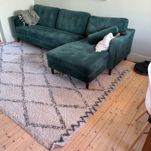 Bomullsteppe Raleigh 170x240 cm. Brukt som stueteppe i ca 2 år. Selges grunnet flytting. Er blitt ganske skittent pga flytting og oppbevaring i bod men kan vaskes i maskin eller renses. Kjøpt for 1700 kr.