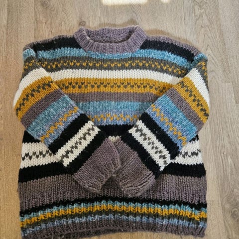 Ull Original håndstrikk med en moderat, velvalgt kombinasjon av farger. Denne genseren vil matche en rekke farger med både bukser og skjørt. Fargene inneholder beherskede farger.