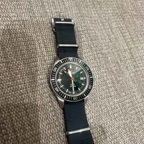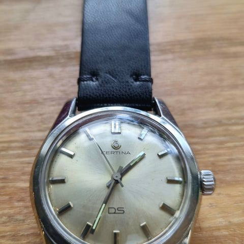 Certina DS Quartz fra 90-tallet, urkasse på 37mm 41mm med krone. Flott hvit urskive, nytt batteri. Tikker og går som den skal. Nyere gummireim med foldespenne. Klokken har noen bruksmerker men fungerer som den skal.
