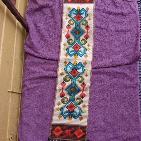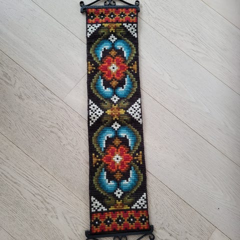 Håndbrodert lite bilde med motiv av kjøkkenting i bondestil.
