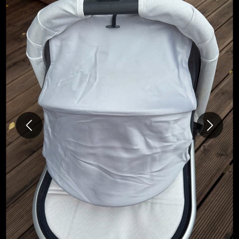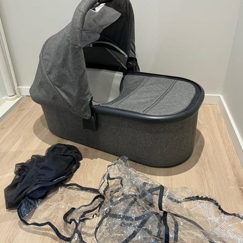 Velholdt og pent brukt. Kvit madrass og svart trekk. Myggnett og regntrekk (nytt) følger med.