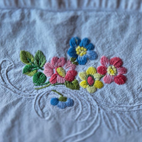 Søt, gammel brodert duk i lin. Alle annonser: 3 for 2.