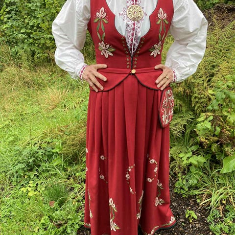 Følgende følger med: Stakk, jakke, forkle og skaut. I tillegg følger alt sølv med som vist på bilder (sølje, mansjettknapper, etc)