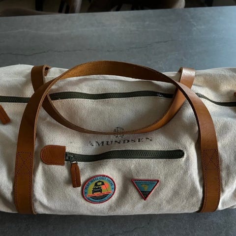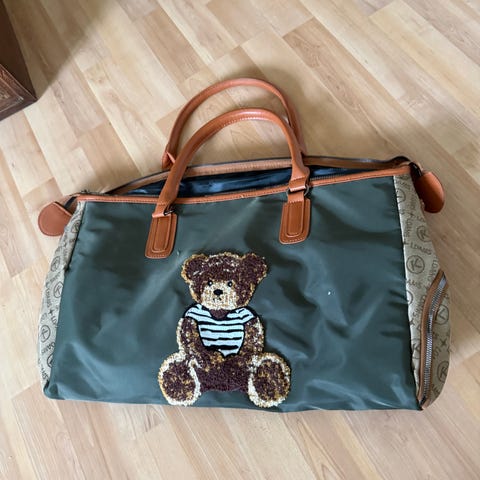 Manini bag eller veske. Pent brukt, litt tråder som henger fra håndtak. Glidelåsen hopper noen ganger ut. Kan sees på bilde. Nøkkel til lås følger ikke med. Bredde på 57cm. Tipper du slipper å se for mange som har lik veske med denne.