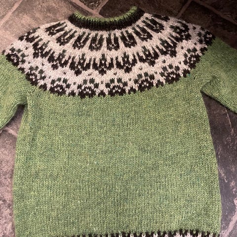 Varm og god genser i Dale ull. Sort bunnfarge med mønster i natur, dyp rød, grå og senneps gul. Pent brukt, nyvasket i Milo.