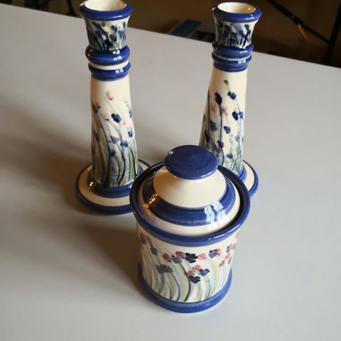 Selger 1 vase og 2 stk lysestaker i porselen. Hel og fine. Vasen er 17 cm høy og lysestakene 9 cm. Kan hentes i Grimstad eller sendes med postnord til 69kr.