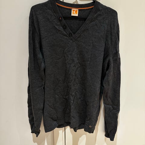 Genser str. L i hugo boss. Har noen hull foran som er sydd igjen med tråd etter vasket i maskin men genseren er behandlet bra ellers og kan fortsatt brukes til vanlig enda.