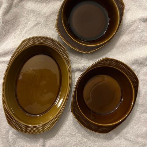 Selger en flott bolle med lokk og en panne samt en sausemugge.. Bollen er 19,5 cm i diameter og 12,5 cm uten lokk. Panna er 20 cm i diameter og 7 cm høy. Ildfast bolle kr.300. Ildfast panne 200kr og sauseskål 150kr. Sauseskål går som liten pakke mens dei andre blir som medium pakke. Eller alt samlet i medium pakke. Har kun bollen med lokk igjen
