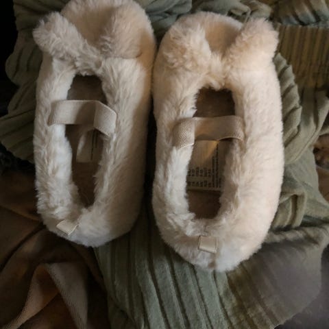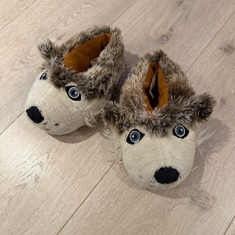 Ultrasøte, myke og morsomme hundetøfler hvor ørene går ut når man tråkker hælene ned (luftputer). Dette var en gave til meg men jeg bruker 40-41 så de er for korte. Innersålen måler drøyt 23 cm og 26 cm yttersåle.