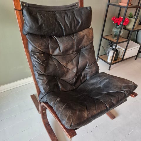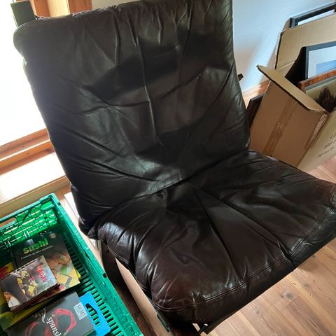 albinihyssna.se, stram arkitektonisk tidløst design. Sort lenestol med skammel til salgs.