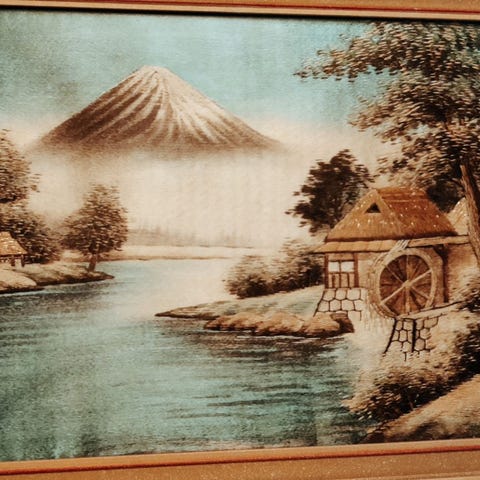 Vi har arvet to nydelige Trådmalerier/stoff fra en onkel. Onkel var sjømann i mange år og kjøpte disse i Asia el.