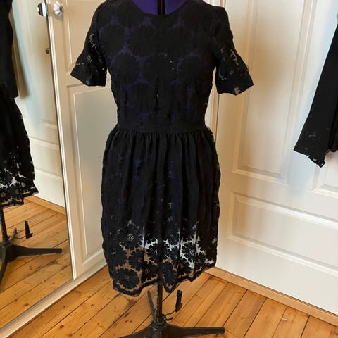 Nydelig blondekjole, lårkort, gammelrosa, korte armer, passer størrelse 40 til 42, muligens også 38 da den faller pent på kroppen uansett.