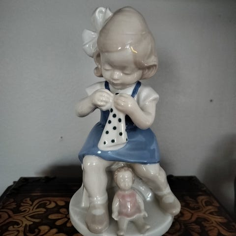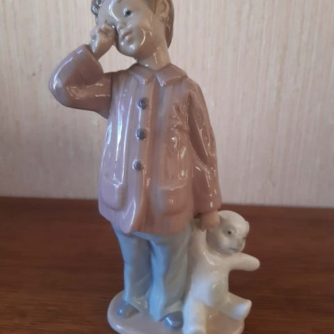 Figur av et barn med hund, laget av porselen. Figuren viser et barn kledd i blått med en stav, stående ved siden av en hund.