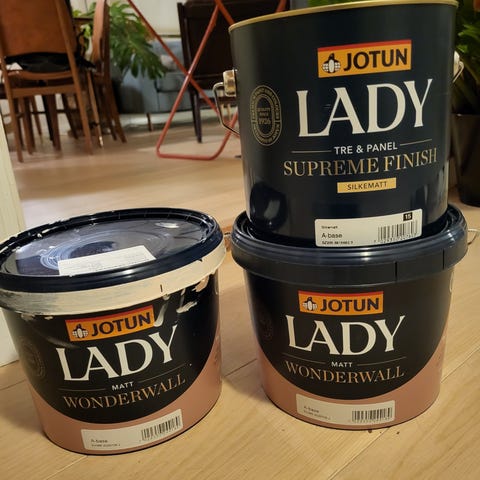 Tre uåpnede spann 2,7 l med Jotun Lady Balance maling i fargen Soft comfort selges.